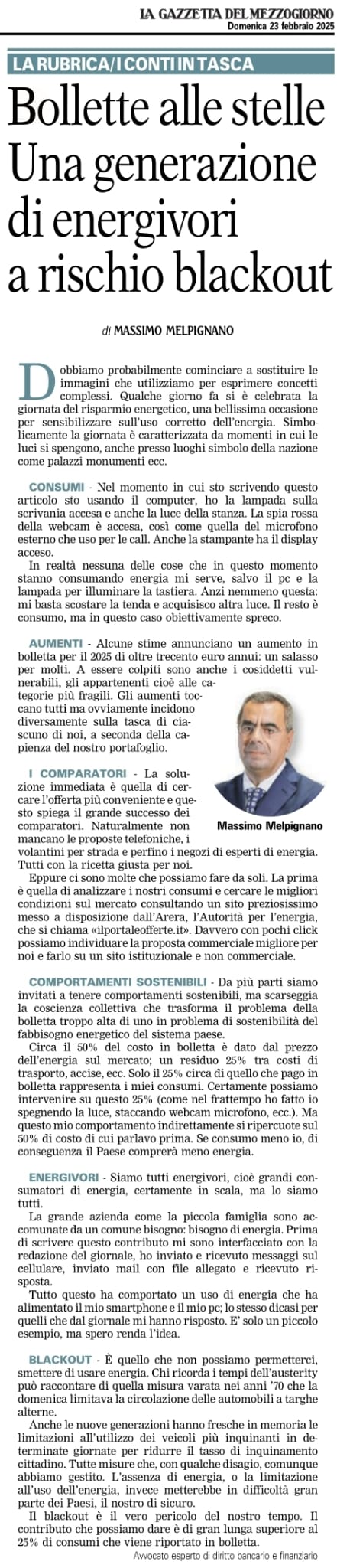AUMENTI. Alcune stime annunciano un aumento in bolletta per il 2025 di oltre trecento euro annui in bolletta: un salasso per molti. A essere colpiti sono anche i c.d. vulnerabili, gli appartenenti cioè alle categorie più fragili. Gli aumenti toccano tutti ma ovviamente incidono diversamente sulla tasca di ciascuno di noi, a seconda della capienza del nostro portafoglio.