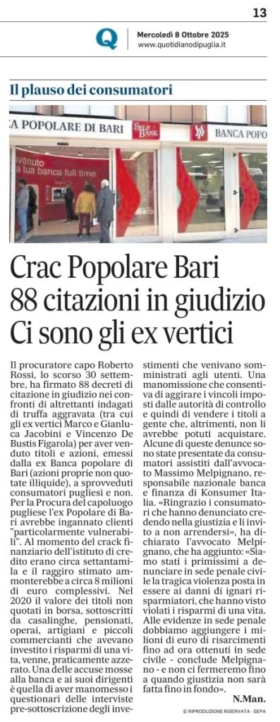 I vertici della ex Banca Popolare di Bari rinviati a giudizio per la tragica violenza economica posta in essere ai danni dei risparmiatori che hanno visto violati i risparmi di una vita.