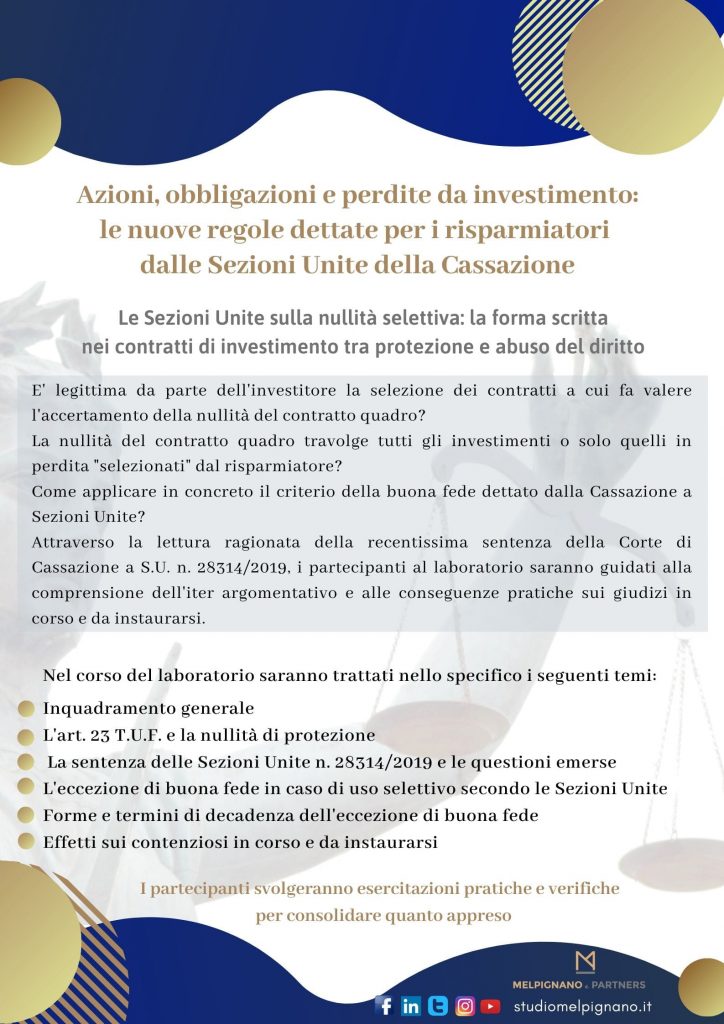 Venerdì 6 marzo dalle ore 15-19, si svolgerà a Bari il laboratorio di diritto bancario e finanziario dal titolo “Azioni, obbligazioni e perdite da investimento: le nuove regole dettate per i risparmiatori dalle Sezioni Unite della Cassazione”.