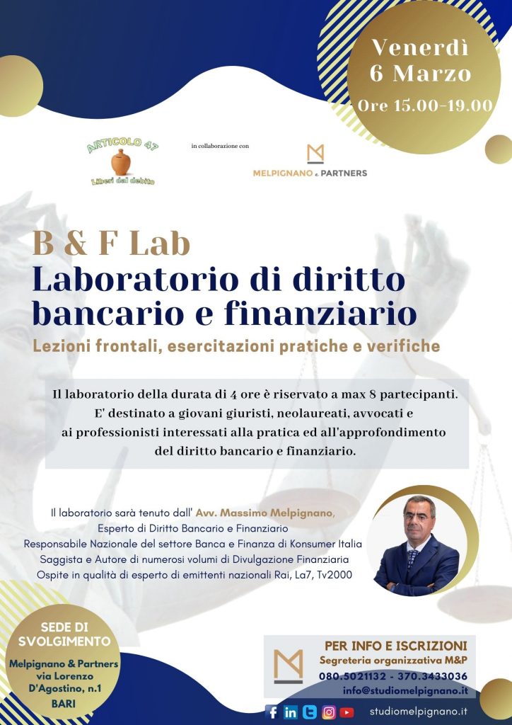 Il laboratorio promosso dall’ ass. di promozione e solidarietà sociale “Articolo 47 – Liberi dal Debito” in collaborazione con lo studio legale Melpignano, è riservato a max 8 partecipanti ed è aperto a studenti, neolaureati, giovani giuristi e a tutti i professionisti che vorranno approfondire e ampliare le proprie conoscenze in questo settore.