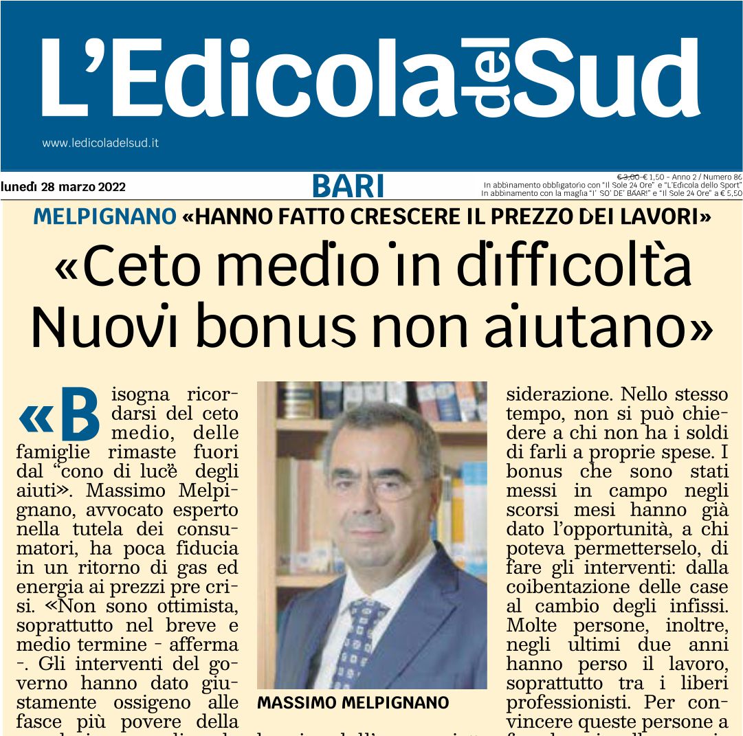 L’Edicola del Sud di lunedì 28 marzo 2022 pubblica un articolo dell’Avv. Melpignano sul tema delle difficoltà generate dal caro bollette e dal lievitare dei costi dovuti ai nuovi bonus edilizia.