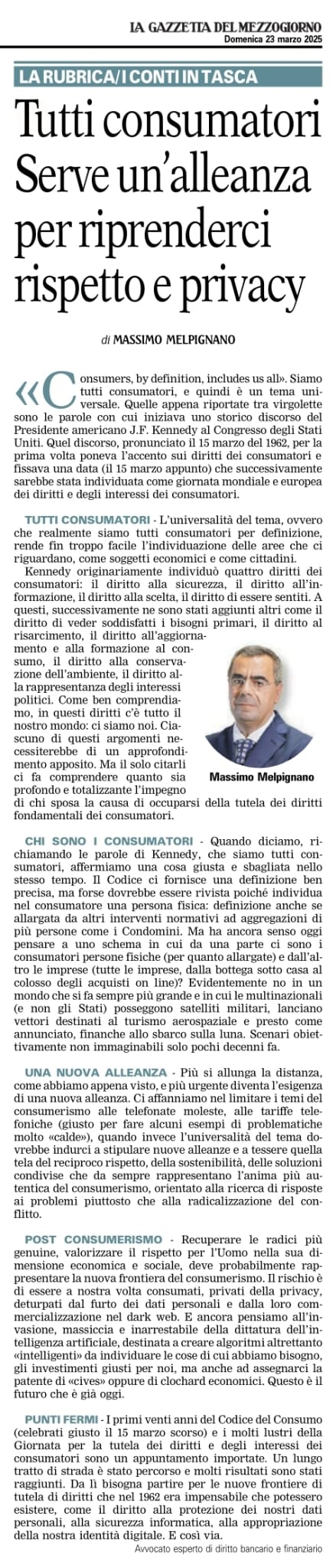 PUNTI FERMI. I primi venti anni del Codice del Consumo (celebrati giusto il 15 marzo scorso) e i molti lustri della Giornata per la tutela dei diritti e degli interessi dei consumatori sono un appuntamento importate. Un lungo tratto di strada è stato percorso e molti risultati sono stati raggiunti. Da lì bisogna partire per le nuove frontiere di tutela di diritti che nel 1962 era impensabile che potessero esistere, come il diritto alla protezione dei nostri dati personali, alla sicurezza informatica, alla appropriazione della nostra identità digitale. E così via.
